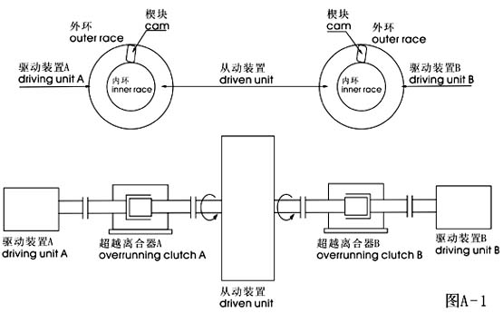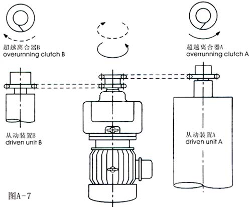 A-7.通過超越離合器輸入端的正反轉(zhuǎn)選擇性的驅(qū)動(dòng)兩個(gè)從動(dòng)裝置的應(yīng)用(見圖A-7)