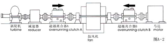 超越離合器成為兩個(gè)驅(qū)動(dòng)裝置的轉(zhuǎn)換開關(guān)(高速或中低速)。水泥爐或傳送帶在正常的操作下,驅(qū)動(dòng)速 度轉(zhuǎn)換到高速。當(dāng)它們作為別的用途時(shí),驅(qū)動(dòng)速度轉(zhuǎn)換到中低檔。(圖A-5)顯示了一個(gè)用來熔化鋁和鋼 錠的均熱槽的鼓風(fēng)機(jī),有一個(gè)超越離合器被用于節(jié)約能量。加熱分兩步,其一是快速加熱,其二是持續(xù)加 熱。它們之間的轉(zhuǎn)換 由驅(qū)動(dòng)系統(tǒng)自動(dòng)完成。快速加熱時(shí),鼓風(fēng)機(jī)由主馬達(dá)高速驅(qū)動(dòng)(此時(shí)超越離合器處 于超越旋轉(zhuǎn)狀態(tài))。恒溫加熱時(shí),由于鼓風(fēng)機(jī)只是低速旋轉(zhuǎn),它被一個(gè)齒輪傳動(dòng)馬達(dá)所驅(qū)動(dòng)(超越離合器 結(jié)合,主馬達(dá)和鼓風(fēng)機(jī)同步旋轉(zhuǎn))。相比極性變換或變換器系統(tǒng)而言,這將節(jié)省一大筆設(shè)備成本。