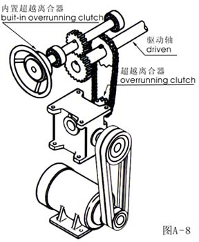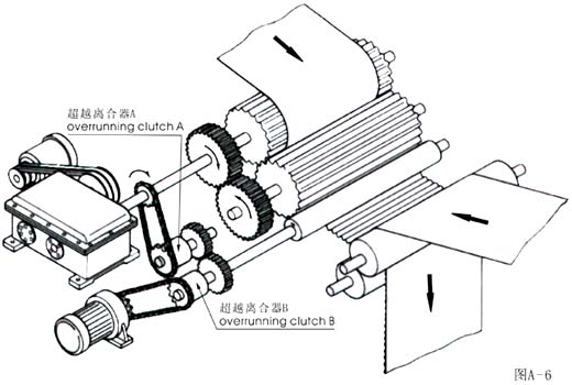 此圖所示為超越離合器用在制造瓦棱紙的設(shè)備的涂膠棍上的例子。涂膠棍由主馬達(dá)持續(xù)驅(qū)動(dòng)。在這期 間, 超越離合器A結(jié)合,超越離合器B解脫。當(dāng)主馬達(dá)必須被停下來進(jìn)行檢修時(shí),為了防止涂膠棍上的膠 面變干,保持涂膠棍旋轉(zhuǎn)是非常必要的。為此,涂膠棍由一臺(tái)輔助馬達(dá)以足以不使膠變干的低速來驅(qū)動(dòng)超 越離合器A解脫超越離合器B結(jié)合)。這個(gè)系統(tǒng)也可用在絞肉機(jī)和飼料壓榨機(jī)等食品處理機(jī)械上。