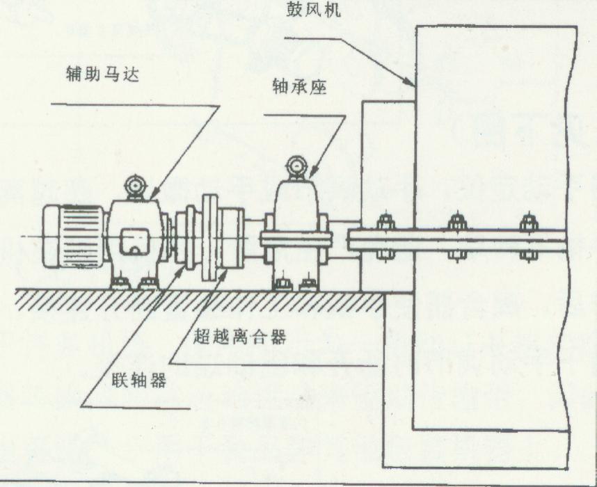 煙塵通風(fēng)和氣體混合鼓風(fēng)機(jī)常運(yùn)行于高溫環(huán)境中。為了防止過度熱傳遞使鼓風(fēng)機(jī)主軸變形,當(dāng)主馬達(dá) 關(guān)停時(shí)用一套輔助驅(qū)動(dòng)系統(tǒng)使鼓風(fēng)機(jī)轉(zhuǎn)軸保持低速旋轉(zhuǎn)??捎靡粋€(gè)超越離合器裝在;輔助馬達(dá)上,從而免 除手工離合操作。鼓風(fēng)機(jī)主軸的熱膨脹必須通過一個(gè)脹縮聯(lián)軸節(jié)所吸收。在主馬達(dá)運(yùn)行期間,超越離合器 作為一個(gè)軸承正常旋轉(zhuǎn),因此,其使用壽命得到極大的提高。