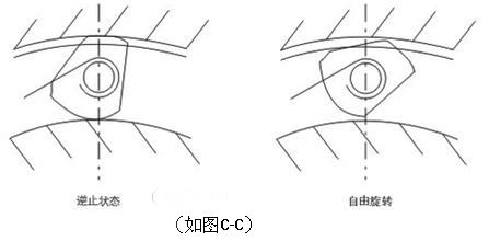 此型設(shè)計之特點為楔塊固定于楔塊保持架中,楔塊保持架與超運轉(zhuǎn)速度之環(huán)體(如內(nèi)環(huán)或外環(huán))結(jié)合。與內(nèi)環(huán)或外環(huán)結(jié)合的楔塊保持架及楔塊轉(zhuǎn)動時會產(chǎn)生離心力,此離心力會抵消或大于楔塊彈簧的力量,從而使楔塊以離心力的方向重新旋轉(zhuǎn)一個角度,而使旋轉(zhuǎn)之內(nèi)環(huán)和外環(huán)與楔塊保持一個無接觸的位置,克服了離合器高速。(如圖C-C)