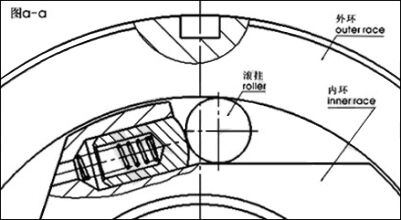 滾柱式單向離合器為外環(huán)與內(nèi)環(huán)之間以圓柱形滾子支撐,而內(nèi)環(huán)安裝有彈簧及頂銷,由頂銷產(chǎn)生一個持續(xù) 的推力,將滾柱往外擠壓便構(gòu)成了外環(huán)、內(nèi)環(huán)及滾柱的接觸結(jié)構(gòu)如下圖,由于滾柱與內(nèi)環(huán)、外環(huán)的接觸為持續(xù)不間斷的,故可立即的反應(yīng)與傳輸扭矩力。此種滾柱型設(shè)計堅固耐用、可靠性高,可適用各種應(yīng)用范圍。例如超運轉(zhuǎn)速度離合器、定位離合器或防止逆轉(zhuǎn)離合器。(如圖a-a)